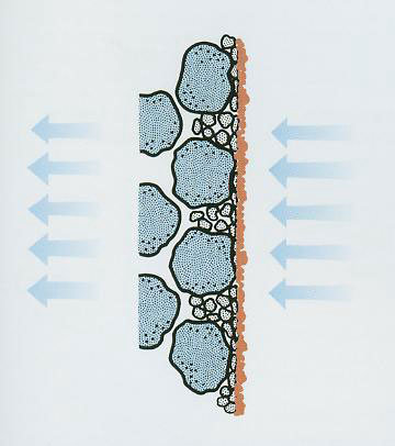 在塑燒濾板的母體基板內(nèi)部,經(jīng)過(guò)對(duì)時(shí)間、溫度的控制燒結(jié)后,會(huì)形成均勻孔隙。然后由樹(shù)脂填充表面處理,使孔隙達(dá)到均勻的u級(jí)微孔。獨(dú)特的表面處理不僅只限于濾板表面,而是深入到孔隙內(nèi)部。見(jiàn)圖一。