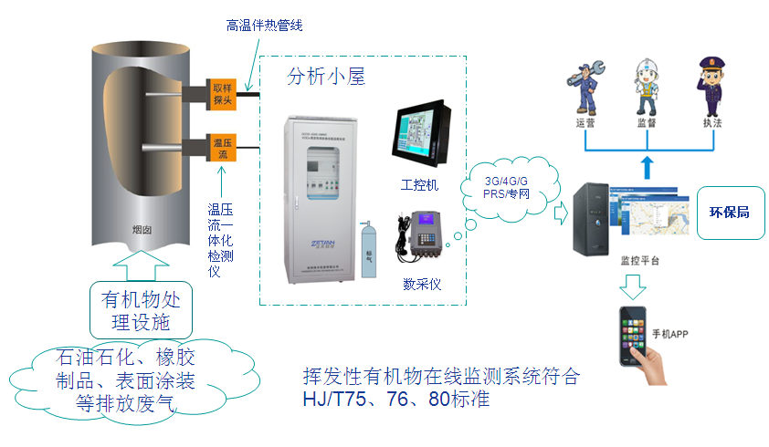 揮發(fā)性有機物煙氣排放連續(xù)監(jiān)測系統(tǒng)采用先進的全程伴熱預(yù)處理+在線色譜技術(shù)+火焰離子檢測法(FID),主要應(yīng)用于對各種工業(yè)污染源排放有機物的實時監(jiān)測,本系列在線氣相色譜分析儀采用國際先進技術(shù),性能穩(wěn)定可靠,自動化程度高,檢測范圍寬,能夠測量VOCS、總烴(THC)、非甲烷總烴(NMHC)、苯及苯系物等多項參數(shù),對VOCS的濃度和排放率進行連續(xù)、實時地跟蹤監(jiān)控,并將所有的監(jiān)測參數(shù)傳輸至工控機軟件和用戶DCS系統(tǒng),可通過數(shù)采儀與環(huán)保部門的數(shù)據(jù)系統(tǒng)通訊。系統(tǒng)設(shè)備放置在分析小屋內(nèi),操作和維護方便,具有現(xiàn)場數(shù)據(jù)實時傳送、遠程故障診斷等功能,實現(xiàn)了工作現(xiàn)場的無人值守。整套系統(tǒng)結(jié)構(gòu)簡單,模塊化設(shè)計,穩(wěn)定性強,運行成本低。