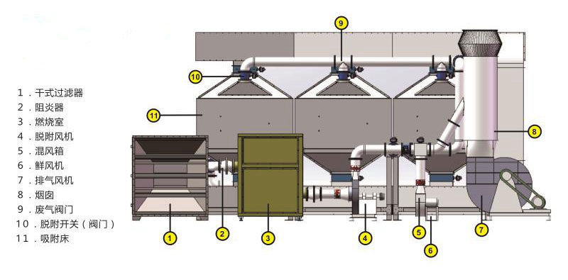 (2)有機廢氣中的粉塵顆粒物較多,采用活性炭(或分子篩)吸附時需將漆霧顆粒物去除,前處理采用干式精濾除塵方式。