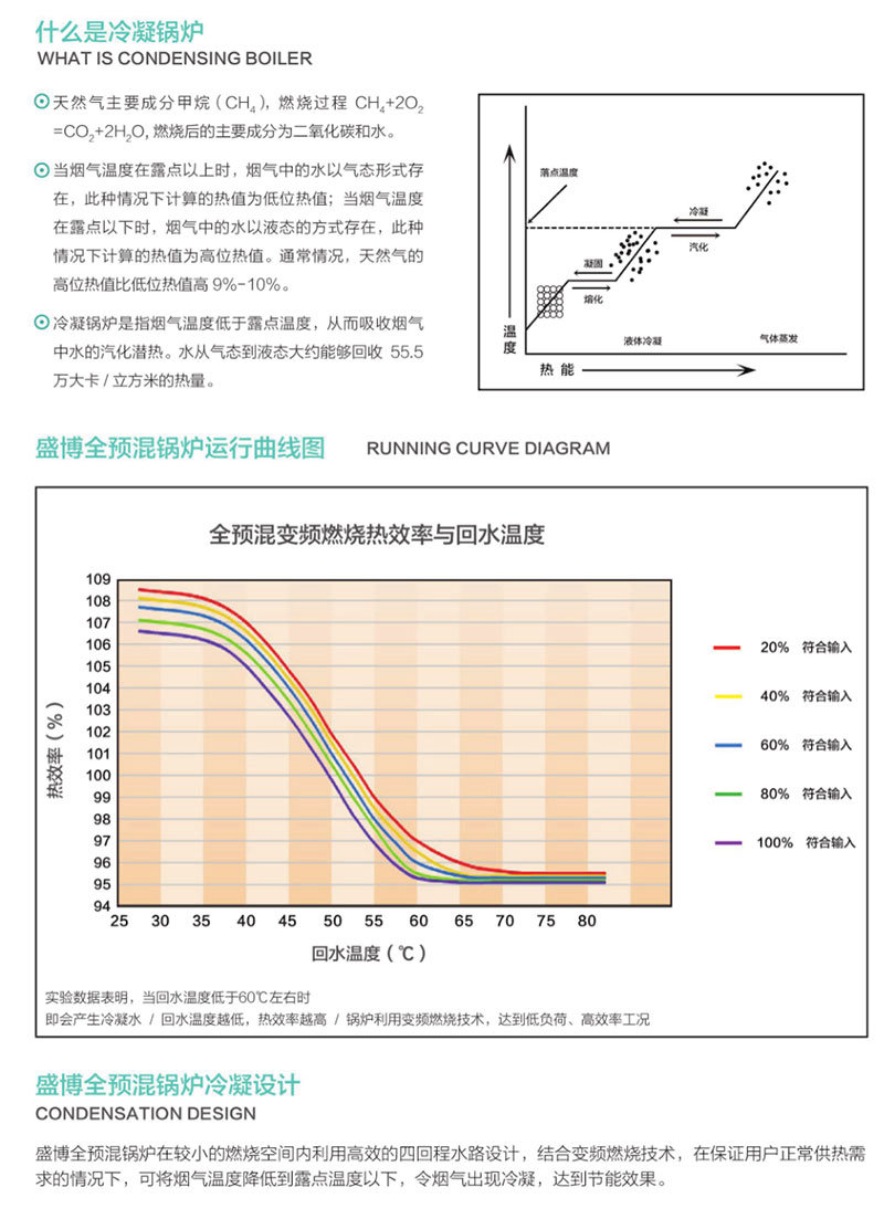 全預(yù)混燃?xì)忮仩t,采用歐美全預(yù)混燃燒技術(shù),融合盛博環(huán)能科技專用低氮燃燒器和盛博環(huán)能科技自主研發(fā)的四回程翅片式換熱器,換熱效率高達97%,滿足中國及全球嚴(yán)格的NOx排放標(biāo)準(zhǔn)。
